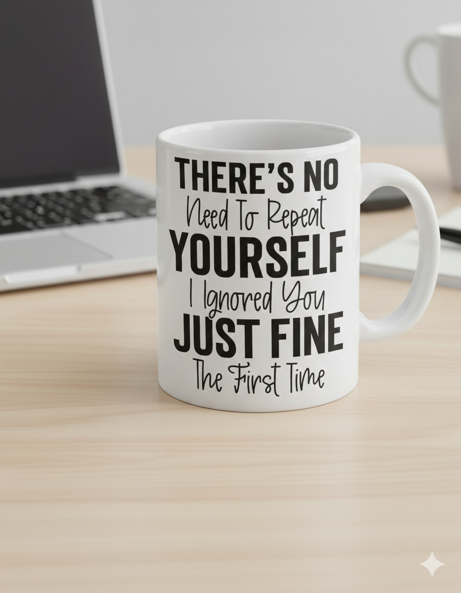 Featuring the witty phrase "THERE’S NO Need To Repeat YOURSELF I Ignored You JUST FINE The First Time," this mug blends bold block lettering with a casual script for a modern, sarcastic look that fits any desk.